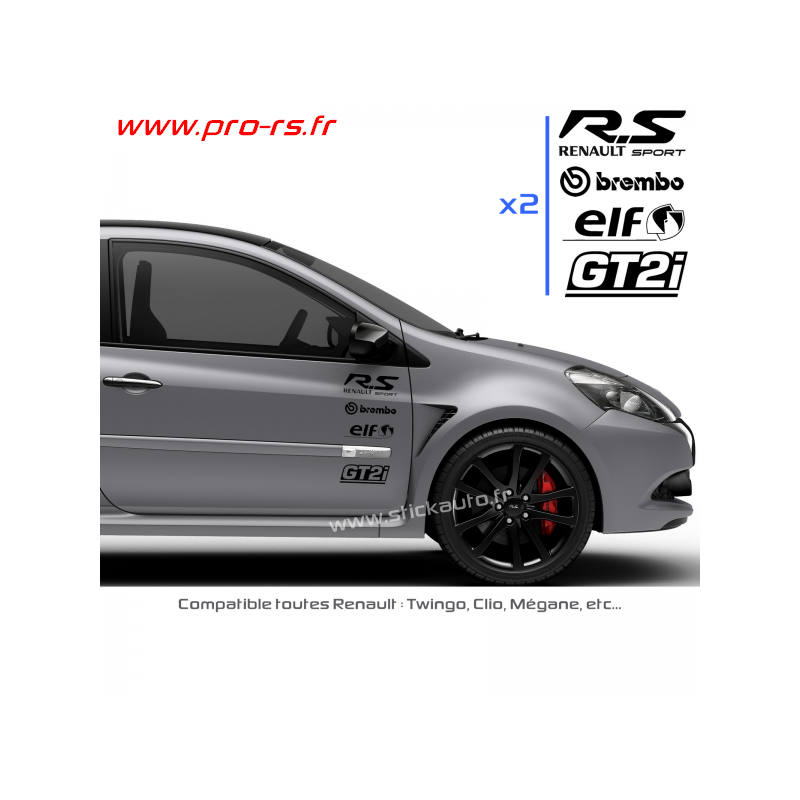 2 Stickers RS Renault Sport 18cm, 2 Stickers Brembo 15cm, 2 Stickers Elf 15cm et 2 Stickers GT2i 14cm.